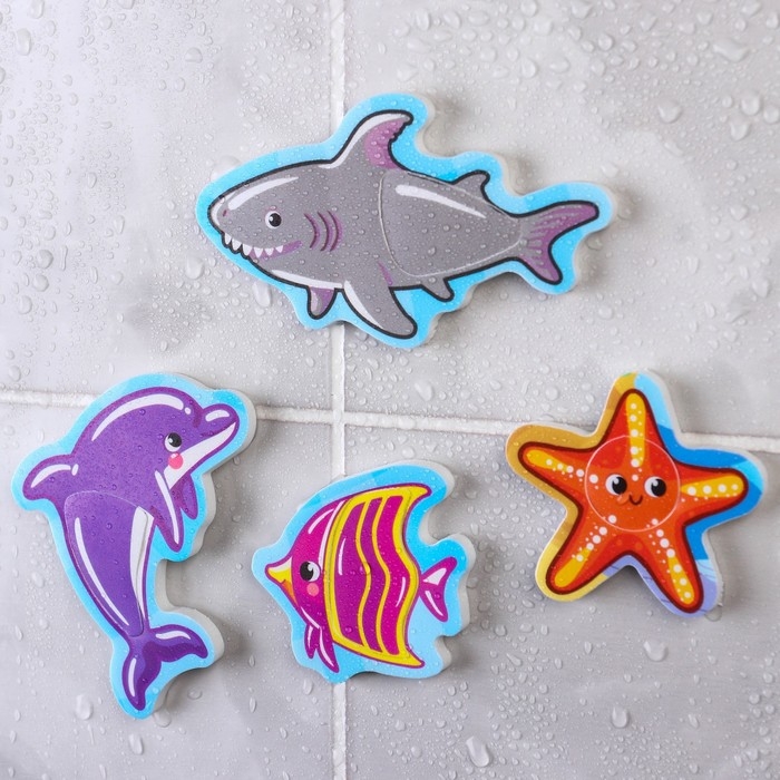 Забавные игрушки из мягкого материала не тонут в воде и при намокании приклеиваются к кафелю или ванне.