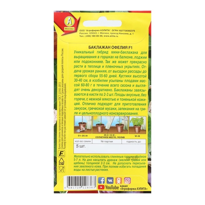 Уникальный гибрид мини-баклажана для выращивания в горшках на балконе, лоджии или подоконнике. Так же может прекрасно расти в теплице и пленочных укрытиях. Отдача урожая ранняя, от высадки рассады до первого сбора 55-60 дней. Кустики высотой 30-40 см, в изобилии усыпаны плодами массой 60-80 г в течение всего сезона и выглядят очень декоративно. Баклажаны завязываются в кисти по 2-3 шт. Плоды вкусные, без горечи, с нежной мякотью и тоненькой кожицей. Отлично подходят для приготовления закусок, греческой мусаки, запекания на гриле и цельноплодного консервирования. Желательно использовать глиняные горшки объёмом 5-7 л. На дно насыпать дренаж (мелкий гравий или щебень) толщиной 2-3 см. Не допускать пересыхания земляного кома. При поливе избегать попадания воды на листья растения.