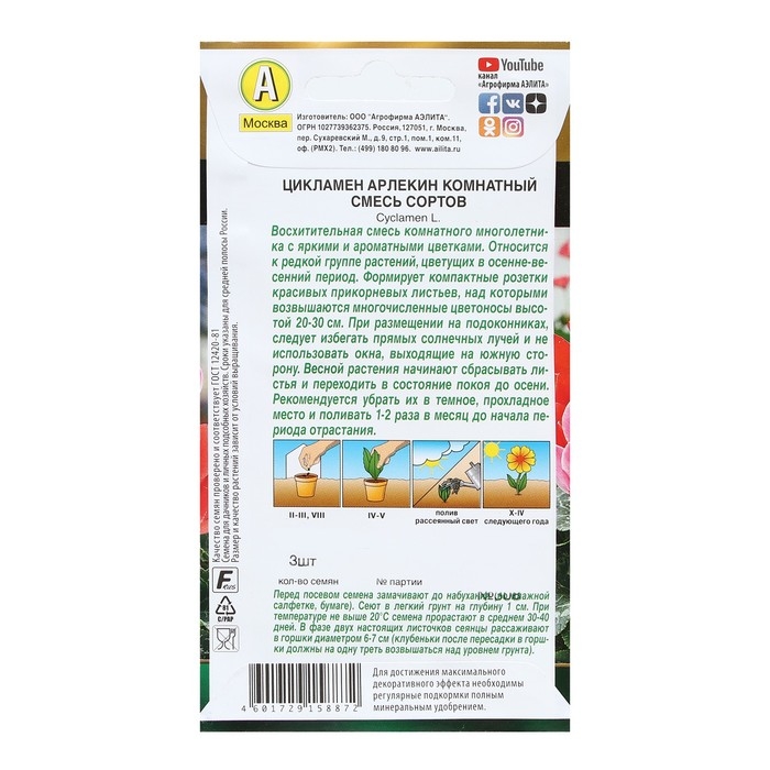 Семена Цветов Цикламен "Арлекин комнатный", смесь сортов, 3 шт
