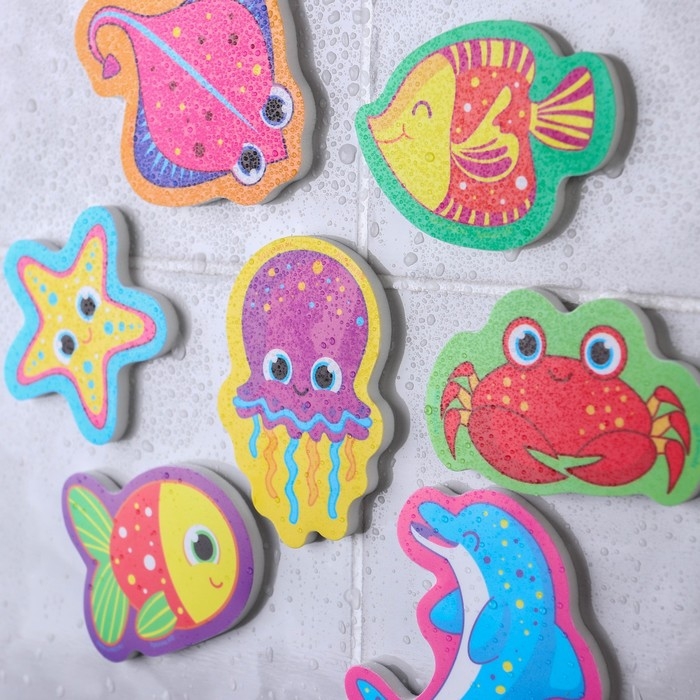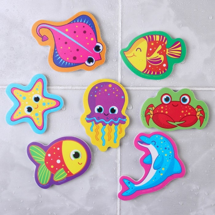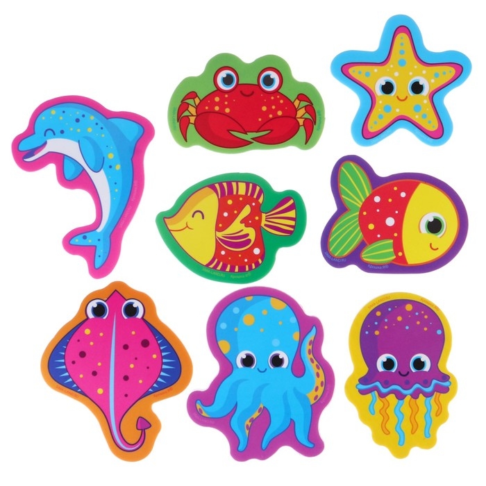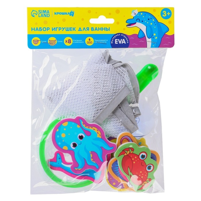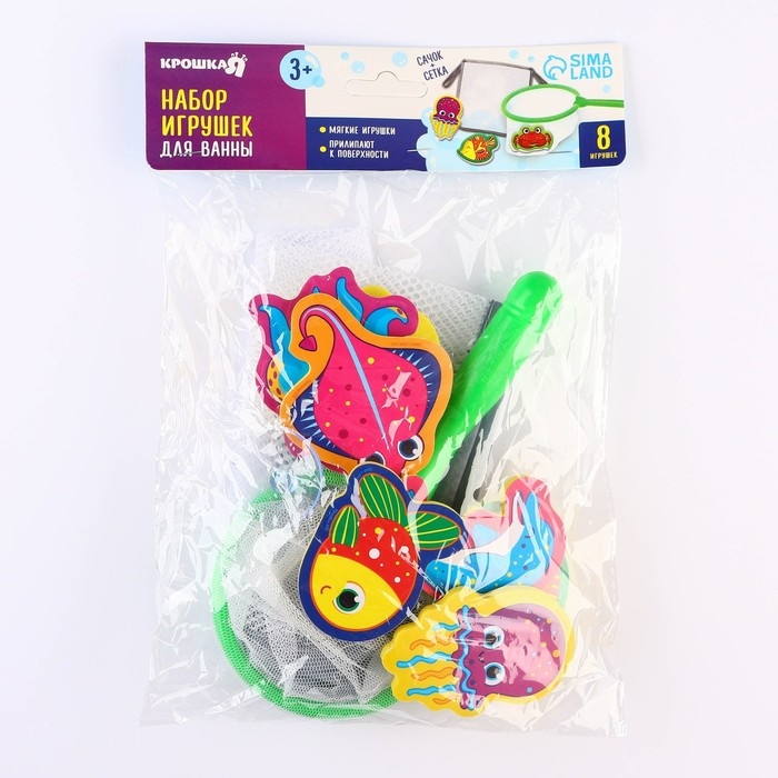 Набор игрушек для ванны "Обитатели моря" 8 штук с сеткой + сачок, Крошка Я