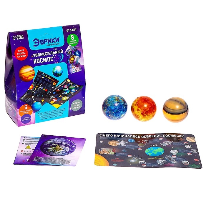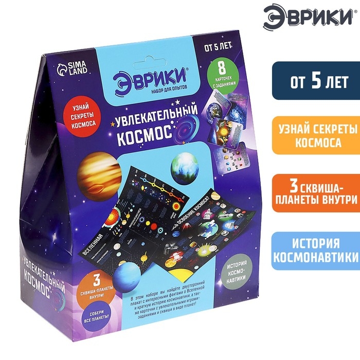 С набором для опытов «Увлекательный космос» ребёнок узнает о Вселенной, познакомится с историей космонавтики, найдёт карточки с увлекательными играми-заданиями и сквиши в виде планет.