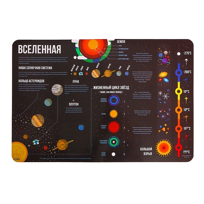 Набор позволит узнать о жизненном цикле звёзд, о том, как появилась вселенная. Ребёнок увидит, из каких слоёв состоит Земля, и узнает, на каком расстоянии от Солнца она находится.