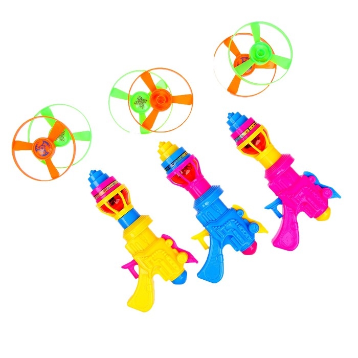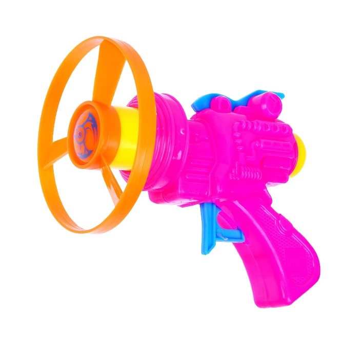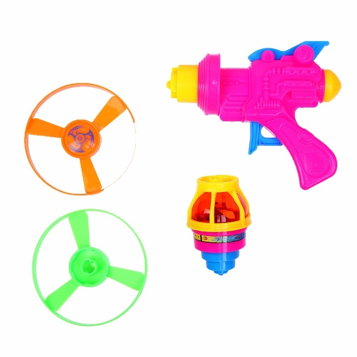 Вертушка «Веселье» — яркий и увлекательный набор для активных игр на свежем воздухе! В комплекте пистолет для запуска и 2 летающих диска и волчок.