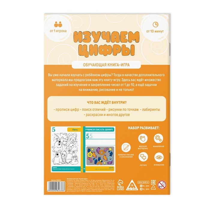 Вы уже начали изучать с ребёнком цифры? Тогда в качестве дополнительного материала мы предлагаем вам эту книгу-игру. Здесь вас ждёт множество заданий на изучение и закрепление чисел от 1 до 10, а ещё задачки на внимание, рисование и не только!.