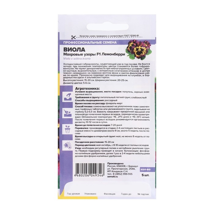 Уникальный гибрид виолы с роскошными супергофрированными цветками. Цветки крупные, выразительные, с интересным сочетанием оттенков: в центре темная «мордашка» на лимонно-желтом фоне и светло-фиолетовая кайма по краям. Растение формирует компактный ровный габитус, предпочитает легкую полутень и прохладу, которая усиливает гофрированность лепестков. Раннее цветение, выровненная форма куста и устойчивость к неблагоприятным погодным условиям делают виолу серии Махровые узоры незаменимой при оформлении контейнеров, вазонов. Прекрасно подойдет для выращивания на клумбах, бордюрах и альпийских горках. При выращивании как двулетника, семена на рассаду высевают в мае-июле на разводочные гряды. В конце августа - начале сентября подросшие сеянцы высаживают на постоянное место. Посадочный интервал 15-20 см. Для получения растений, цветущих в год посева, семена на рассаду высевают в феврале-марте, слегка заделывая. Для достижения наилучшего результата посев рекомендуем проводить в торфяные таблетки (одно драже в таблетку). Посевы увлажняют и накрывают прозрачной плёнкой. Ёмкость помещают в тёплое светлое место с температурой +20-25оС. Пленку периодически снимают для проветривания. Всходы появляются через 7-10 суток. В первые дни сеянцы проветривают 2 раза в сутки по 20-30 минут, постепенно увеличивая временной интервал, полностью пленку снимают через неделю. Пикировка на 6-8 неделе в горшки 10 см. Растения беречь от попадания прямых солнечных лучей. В открытый грунт рассаду высаживают в конце мая – начале июня, когда минует угроза возвратных заморозков. Цветение при выращивании рассадой с августа до заморозков, при посеве семян в грунт – на следующий год с ранней весны до поздней осени. Внимание! Семена дражированные - оболочку драже не разрушать!