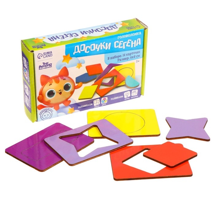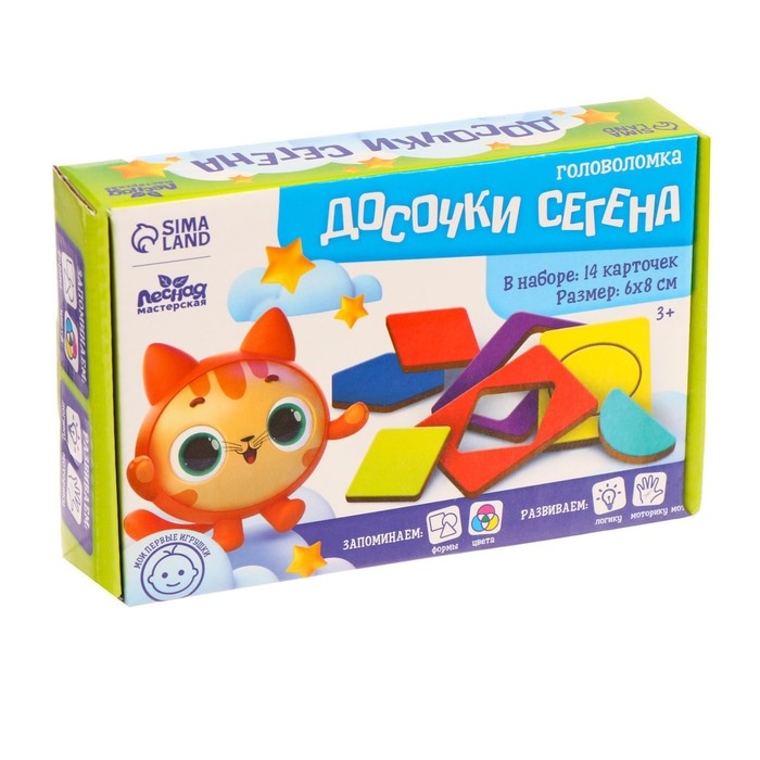 Головоломка «Досочки Сегена» — это классическая развивающая игра, созданная по методике Эдуарда Сегена. В комплект входят досочки с выемками и соответствующие им фигурные вкладыши, которые ребёнку нужно будет вставлять на свои места. Простая, но эффективная головоломка развивает мелкую моторику, логическое и пространственное мышление, а также помогает в изучении форм и цветов.
