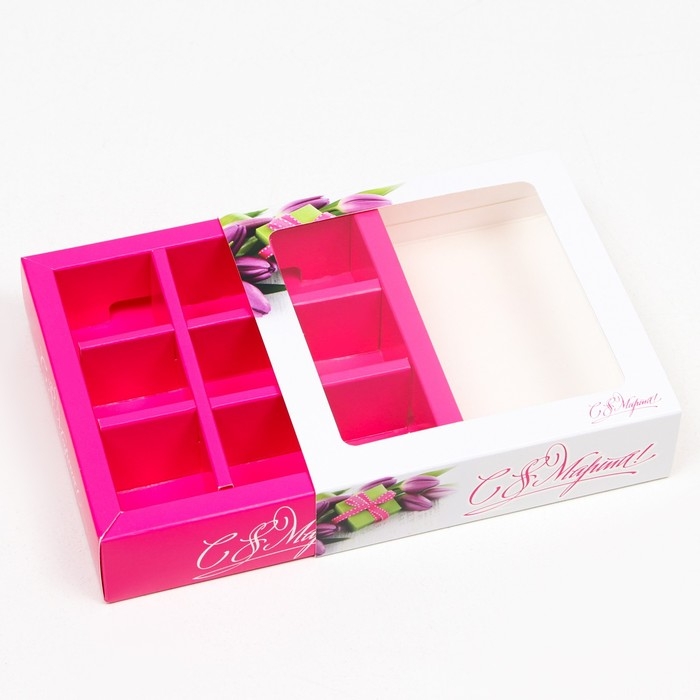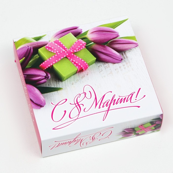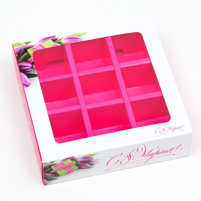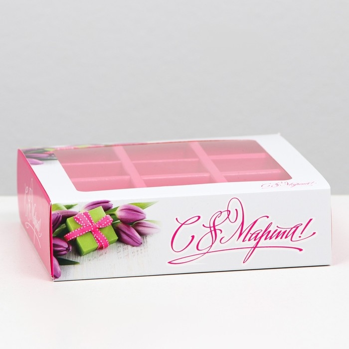 Коробка под 9 конфет с обечайкой "с 8 марта!",тюльпаны, 13,7 х 13,7 х 3,5