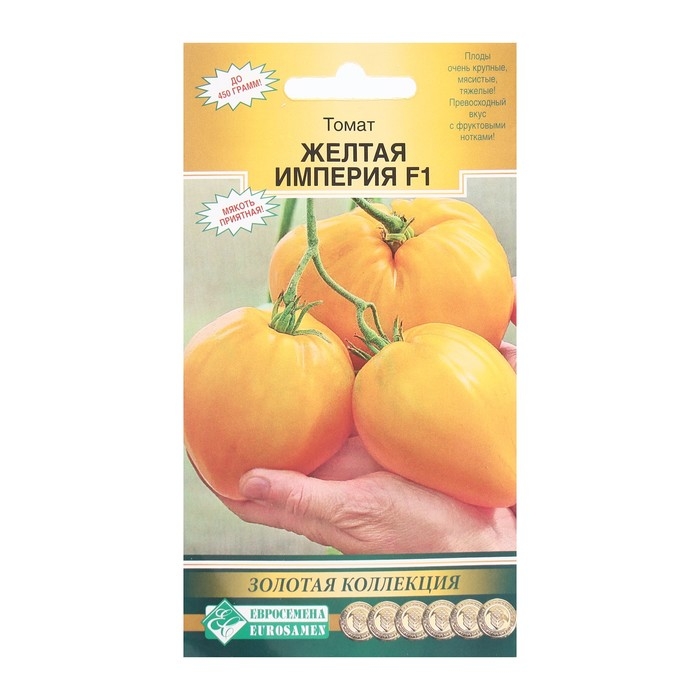 Гибрид раннеспелый, индетерминантный. От всходов до сбора первого урожая около 100 дней. Первое соцветие закладывается после 9-10 листа, последующие через 3. Кисти простые и полу сложные с 5- 7 плодами. Плоды очень крупные, мясистые, тяжелые, поэтому соплодия необходимо надежно фиксировать. Своевременный сбор созревших плодов позволяет получать максимально возможный урожай до конца октября (в средней нечерноземной зоне России), потому как растения хорошо переносят перепады допустимо низких и высоких температур. Плоды массой от 250 до 450 г. Семенные камеры многочисленные, но едва заметны в поперечном разрезе. Мякоть однородной консистенции, приятная, маслянистая, с минимальным количеством семян, цвет насыщенно жёлтый. Форма плодов коническая с тупой вершиной, с небольшой аккуратной ребристостью у плодоножки. Вкус фантастический, очень сладкий, оригинальный, с фруктовыми нотками, кожица тонкая. Томат незаменим в приготовлении салатов, закусок, оформлении блюд, а так же для приготовления необычного цвета и вкуса сока. Гибрид устойчив к вершинной, корневой гнилям и бурой пятнистости. Растение формировать в 1-2 стебля. Плотность посадки 4 растения/м2. Урожайность не менее 18 кг/м2.