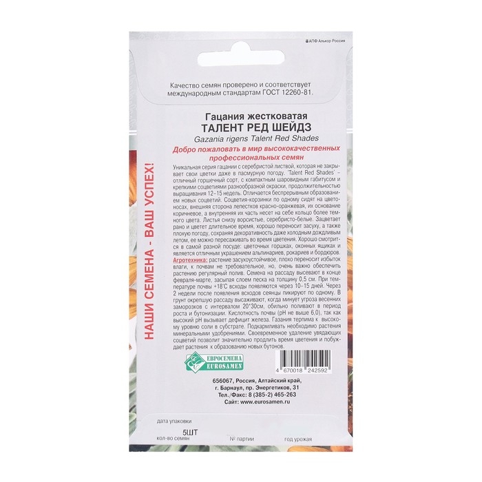 Семена Цветов Гацания жестковатая Талент Ред Шейдз, 5 шт