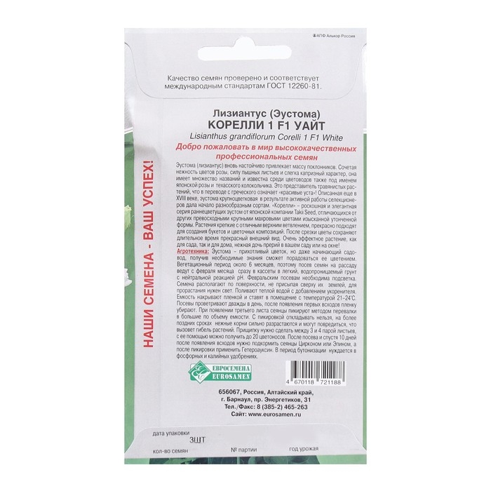Семена Цветов Лизиантус, Эустома 1 Корелли F1 Уайт, 3 драже