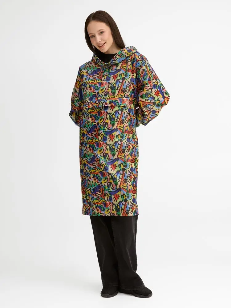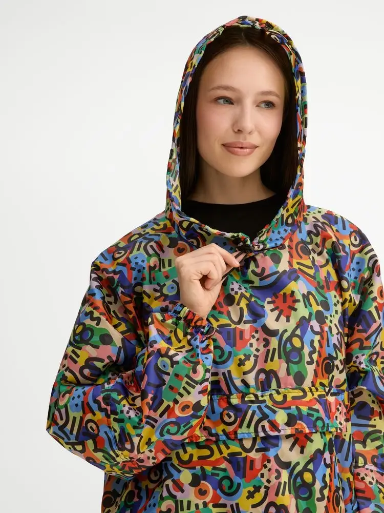 Приложите к заказу оригинал-макет закольцованного бесшовного (endless) узора или паттерна в виде квадрата или прямоугольника с разрешением 300 dpi в масштабе 1 к 1. Полные технические требования к оригинал-макетам смотрите в пункте «Сублимация».Дождевик-анорак с капюшоном из ткани таффета.