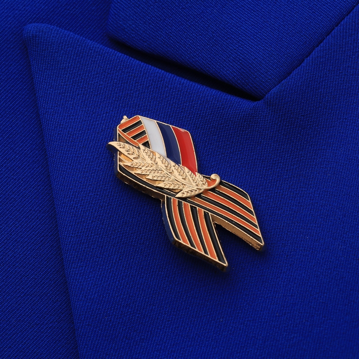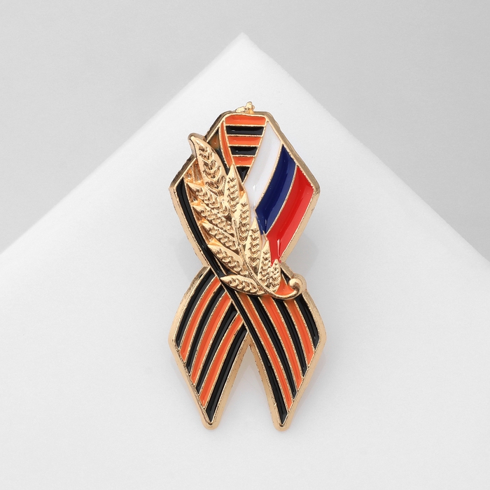 Значок «Георгиевская лента» с флагом России, цветной в золоте