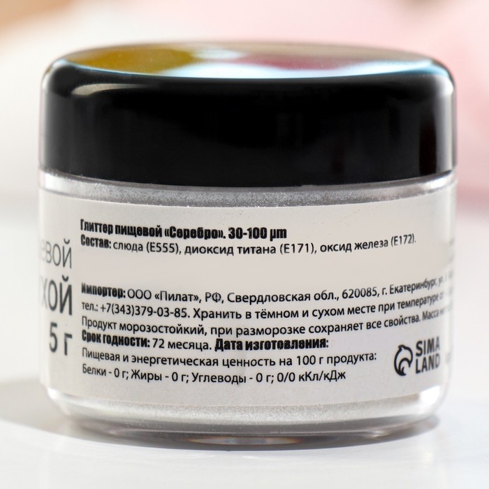 Глиттер кандурин пищевой КондиМир "Серебро", 30 фракция 30-100 µm, 5 г