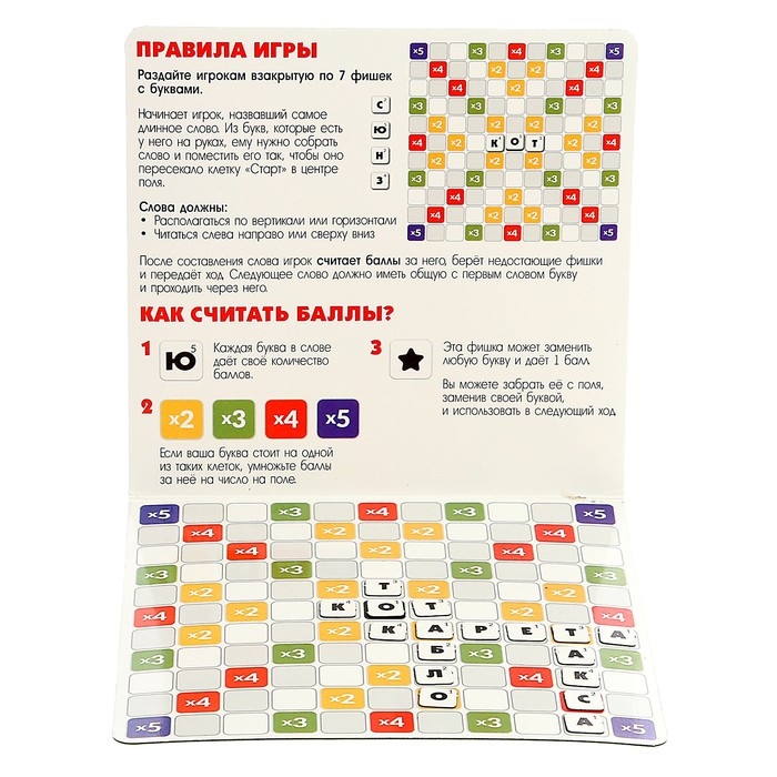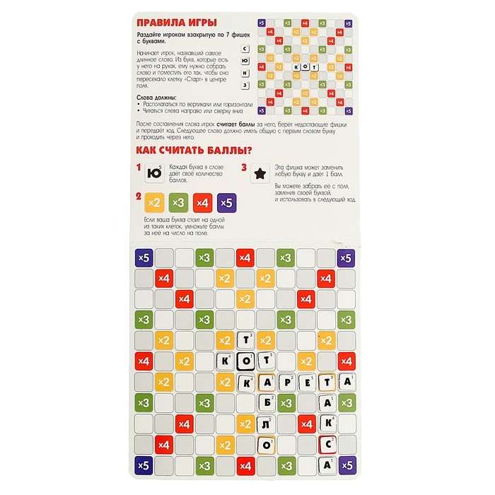 - Если вы поставили букву на одну из цветных клеток, умножьте баллы за эту букву на цифру, указанную на клетке.