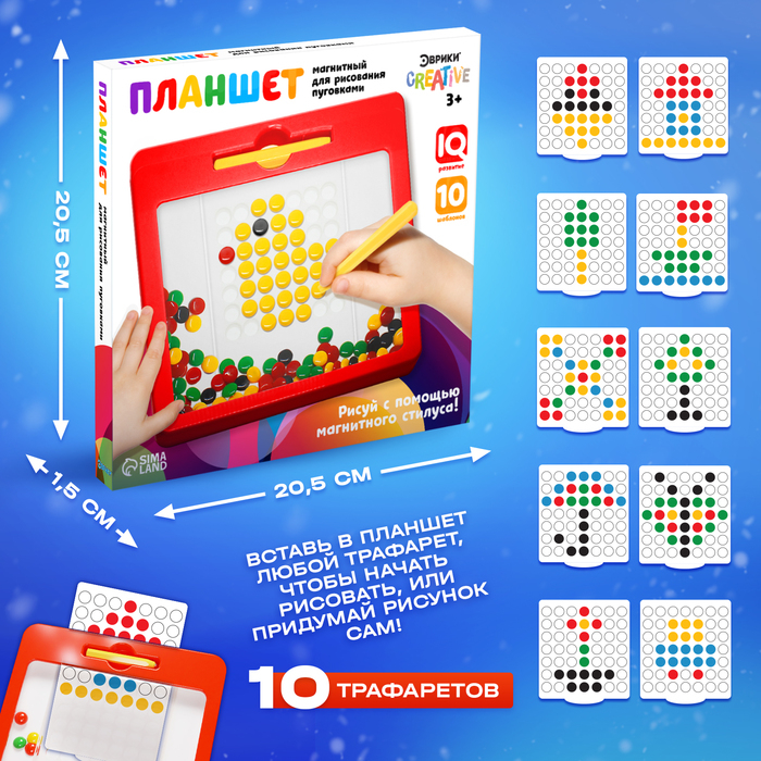 Игра «Магнитное рисование» поможет обучить ребёнка письму в дошкольном возрасте. В комплект входит планшет с разноцветными пуговками и ручка-магнит. Перемещать элементы легко – они сами слушаются палочку с намагниченным наконечником и перелетают в круглые прозрачные ячейки. Малышу не нужно прикасаться к ним руками – чтобы пуговка следовала за стилусом проведите им по понели перемещая в одно из отверстий.