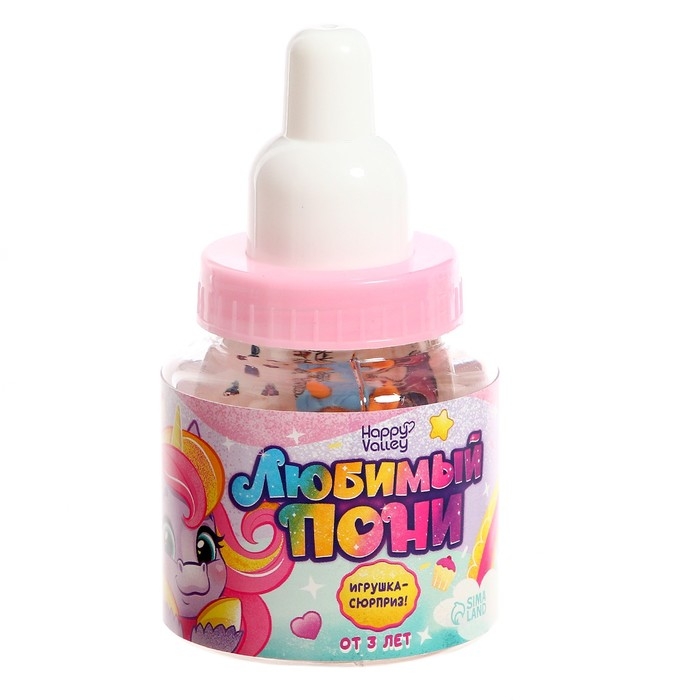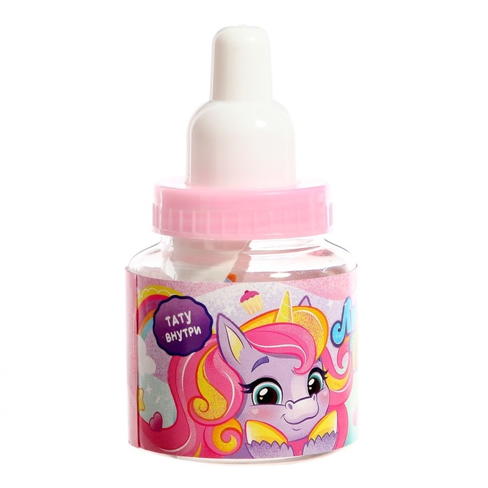 Ваша принцесса любит играть и получать сюрпризы? Тогда этот набор станет отличным подарком, ведь внутри она найдёт игрушку-пони и переводную татуировку! Упаковка выполнена в виде детской бутылочки, поэтому набор можно вручить в подарок даже без дополнительной праздничной упаковки.