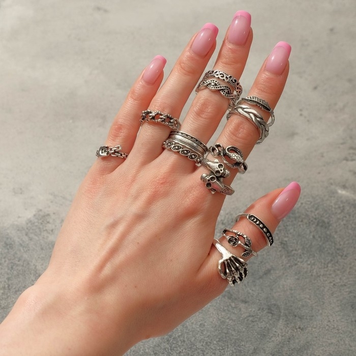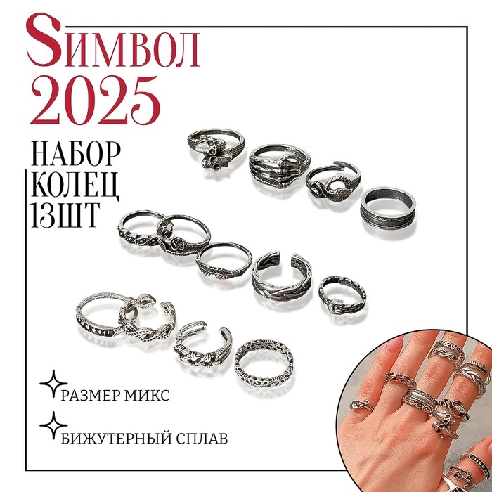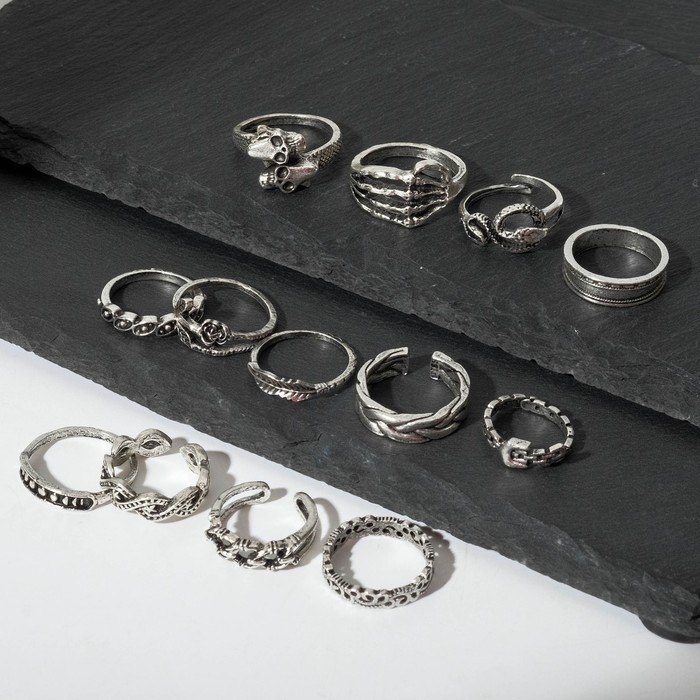 Набор колец 13 штук «Ассорти» скелет, змея, размер МИКС, цвет чернёное серебро