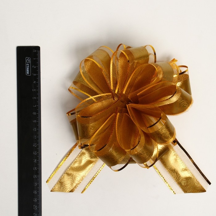 Для того чтобы собрать бант, надо потянуть за две ленточки, находящиеся между широкими лентами, удерживая широкие ленты в месте спайки. Бант собирается за несколько секунд.