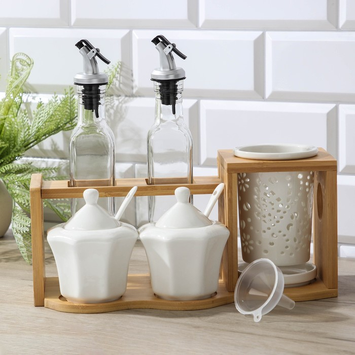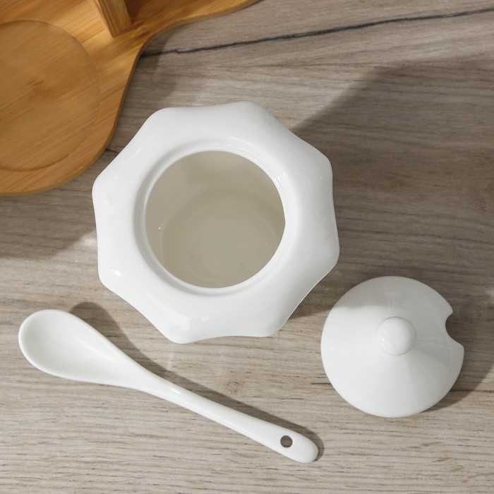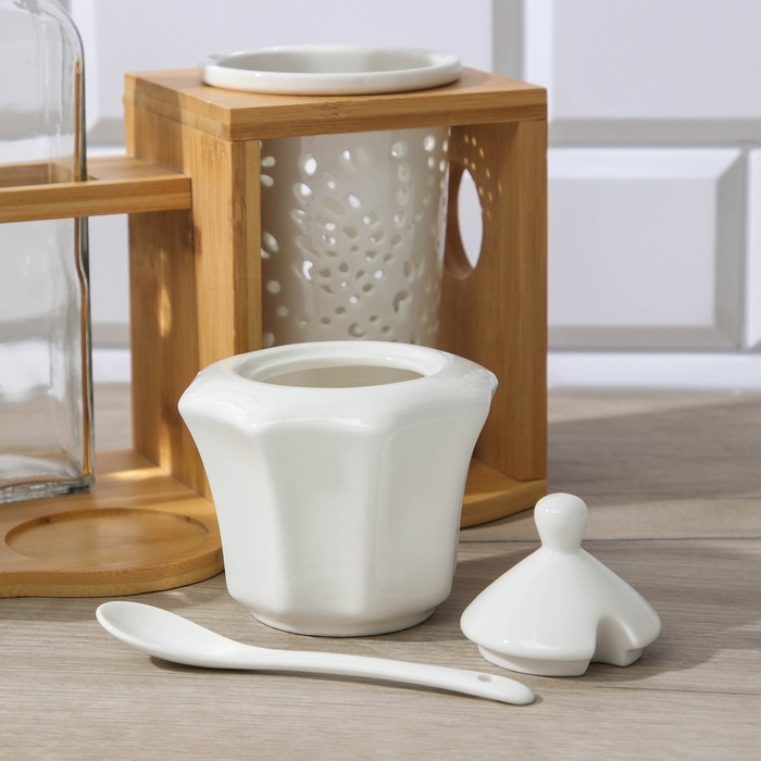Набор керамический сервировочный на деревянной подставке «Эстет», 5 предметов: 2 соусника 300 мл, 2 сахарницы 260 мл, стакан, 2 ложки, цвет белый