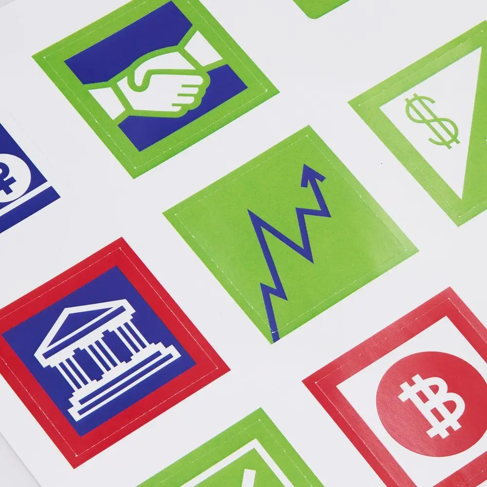 В каждой части общего рисунка изображены главные символы, связанные с финансами.