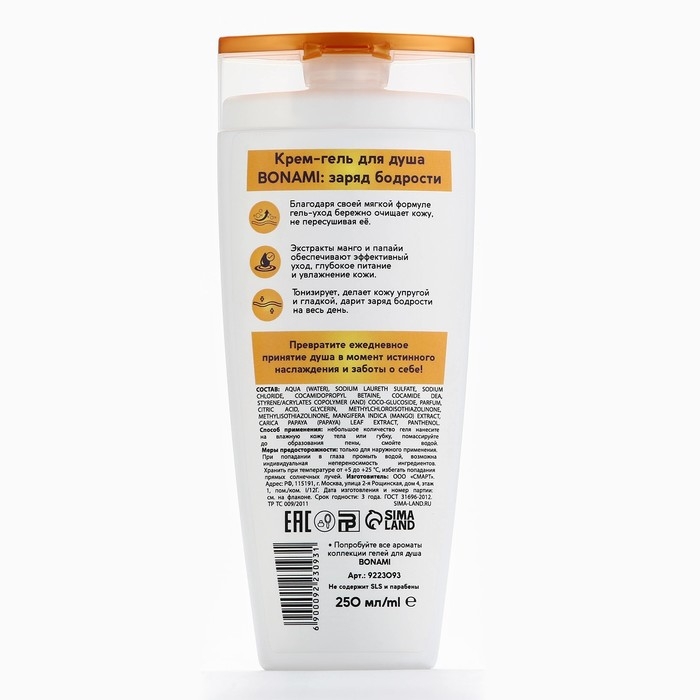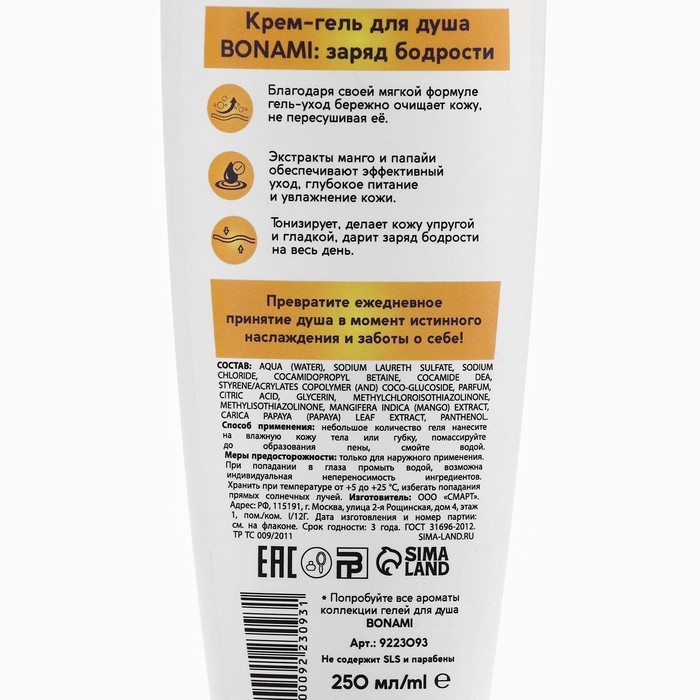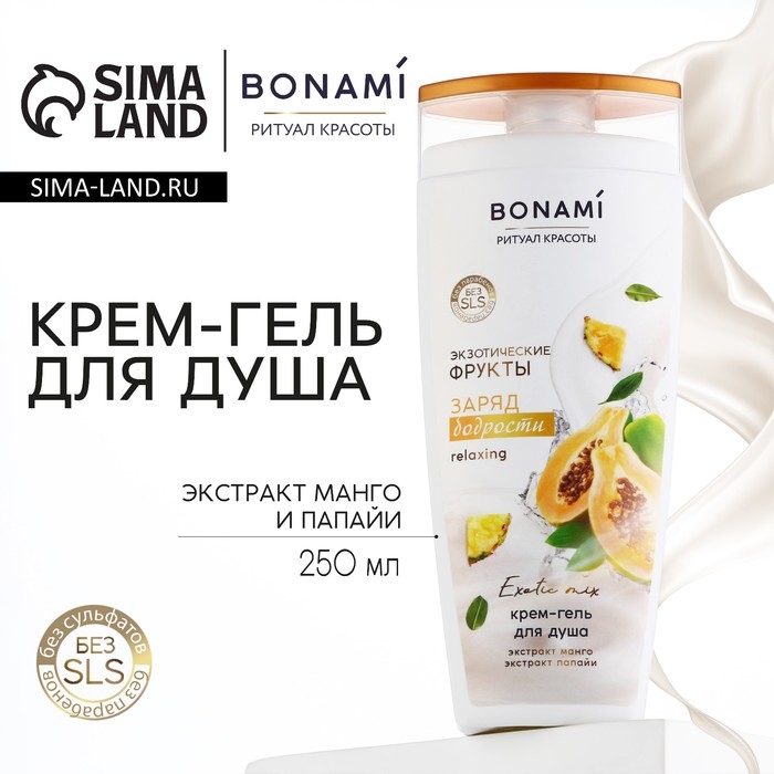 Гель для душа с экстрактом манго и папаий, заряд бодрости, 250 мл, аромат экзотических фруктов, BONAMI