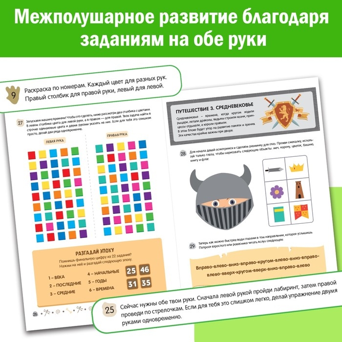 Задания на выполнение обеими руками одновременно, задания на развитие интеллекта, внимания, логики и воображения.