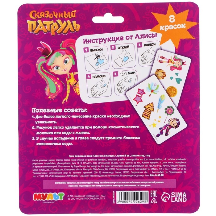 Грим для лица и тела, краски 8 цветов, аппликатор, тату "Подружки", Сказочный патруль