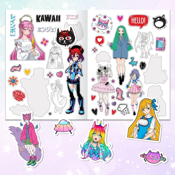 Альбом наклеек станет отличным подарком для юных любителей аниме и манги. Внутри ребёнок найдёт много красочных персонажей в мультяшном стиле.