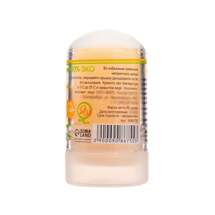Свойства: абсолютно безвреден для организма, так как в отличие от многих современных дезодорантов не содержит хлоргидрат алюминия и прочие вредные химические субстанции. В нем отсутствуют эмульгаторы, закупоривающие поры и потовые протоки, нарушающие функцию потовых желез. Не содержит спирта, не вызывает раздражения или аллергии. В его состав не входят масла, оставляющие пятна на одежде. Единственный безвредный дезодорант, разрешенный к применению беременным и кормящим женщинам.