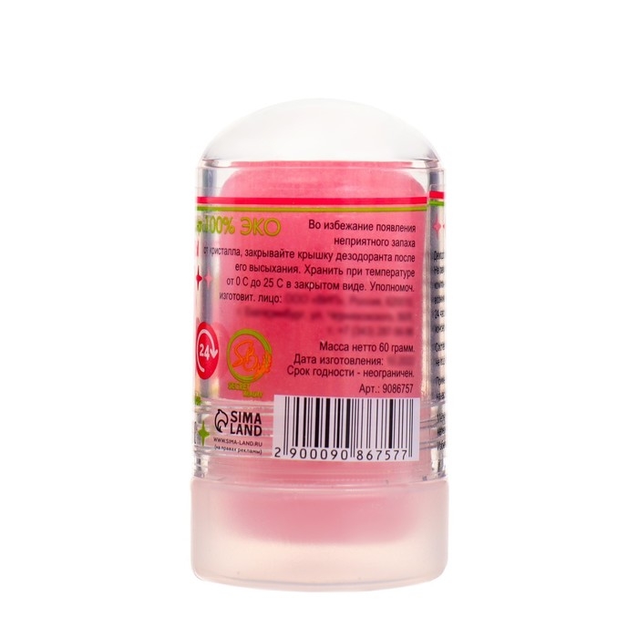 Свойства: абсолютно безвреден для организма, так как в отличие от многих современных дезодорантов не содержит хлоргидрат алюминия и прочие вредняые химические субстанции. В нем отсутствуют эмульгаторы, закупоривающие поры и потовые протоки, нарушающие функцию потовых желез. Не содержит спирта, не вызывает раздражения или аллергии. В его состав не входят масла, оставляющие пятна на одежде. Единственный безвредняый дезодорант, разрешенный к применению беременным и кормящим женщинам.
