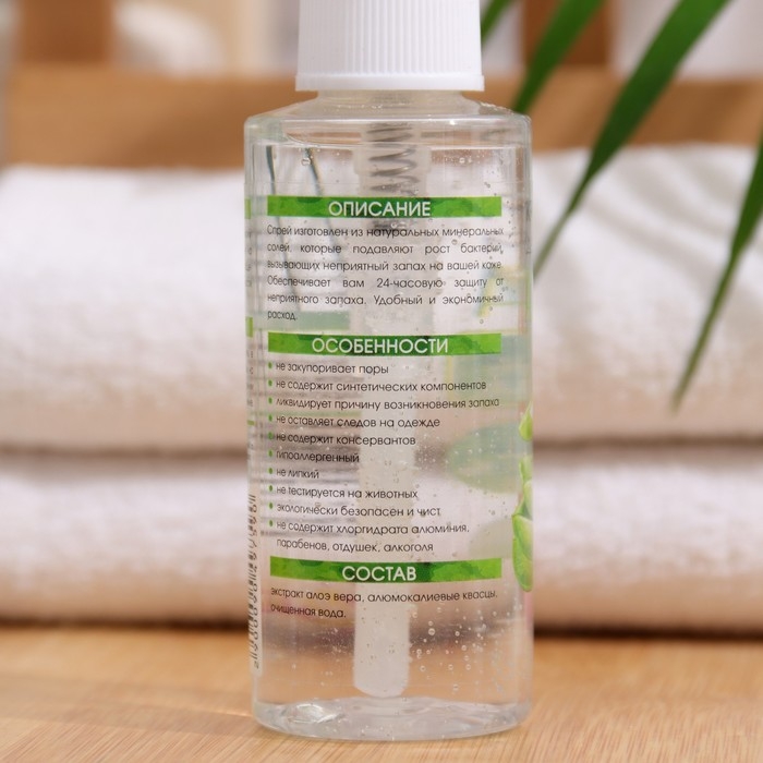 Натуральный минеральный дезодорант поможет сохранить эффект свежести на протяжении всего дня. Активные компоненты нейтрализуют неприятный запах, экстракт алоэ вера обладает бактерицидным и противовоспалительным свойствами. Спрей можно использовать как для тела, так и для ног. Эффективен при занятиях спортом.
