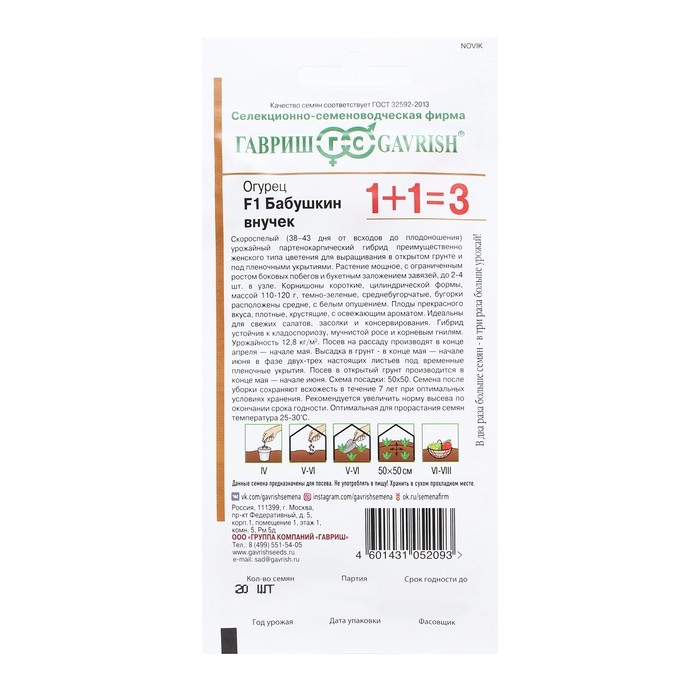 Семена Огурец "Бабушкин внучок", F1, корнишон, серия 1+1, 20 шт