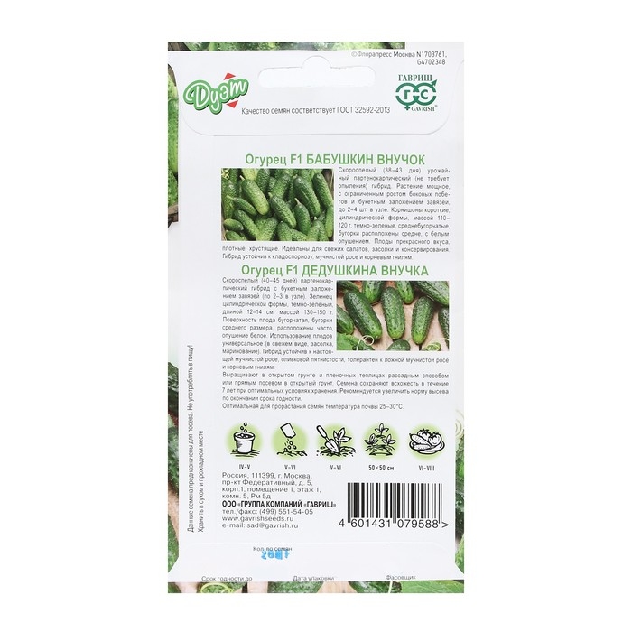Семена Огурец "Бабушкин внучок", F1, 10 шт + "Дедушкина внучка" F1, 10 шт серия Дуэт