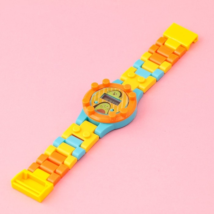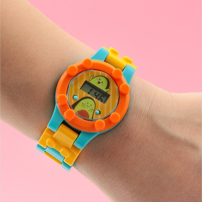Электронные часы с ремешком-конструктором станут ярким аксессуаром вашего ребенка, съемные ремешки позволят скорретировать нужную длину (инструкция по сборке расположена на обороте упаковки). Часы показывают число, время и месяц.