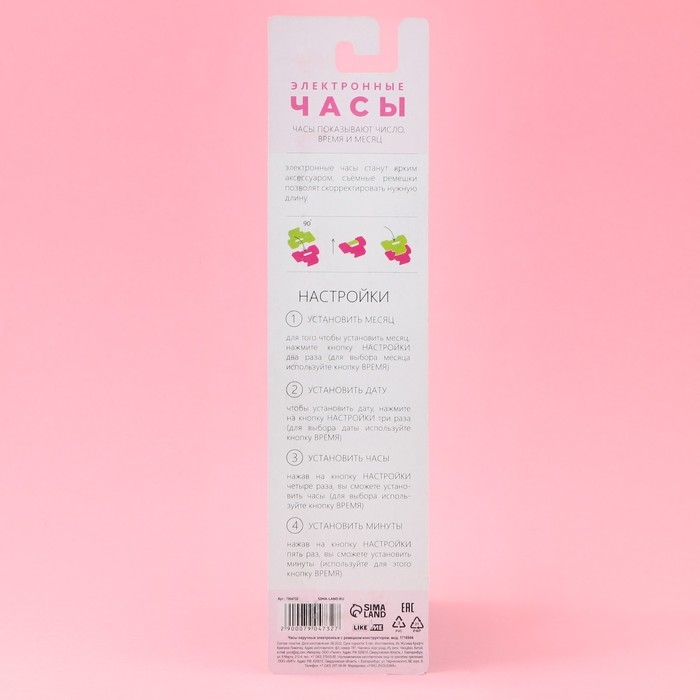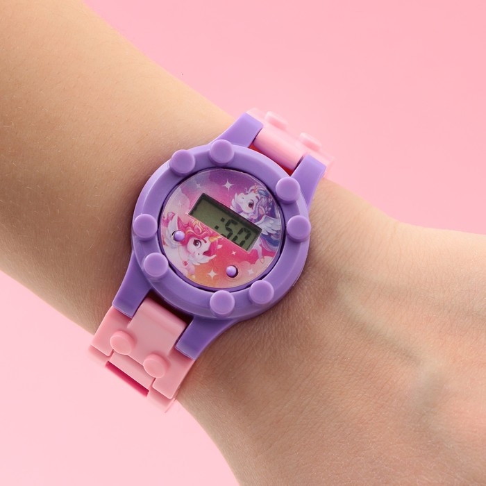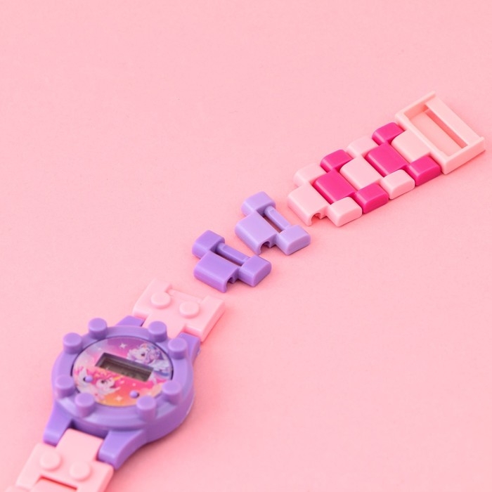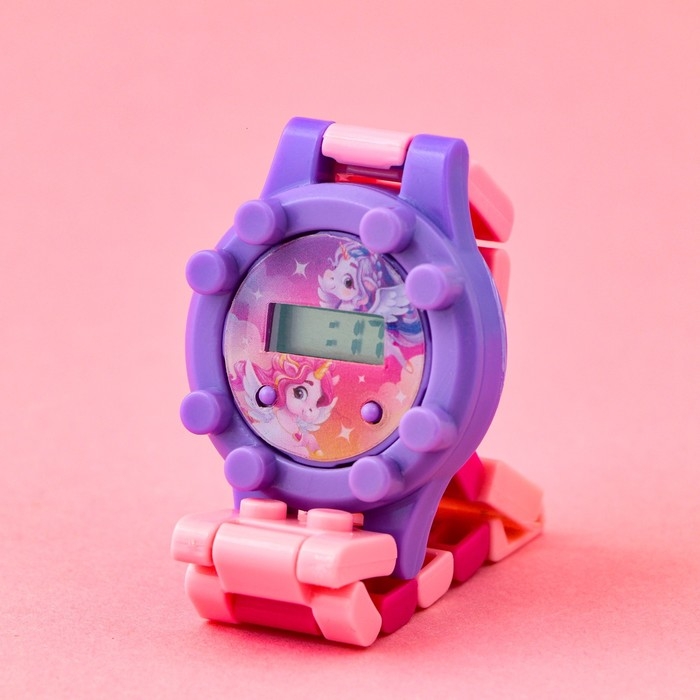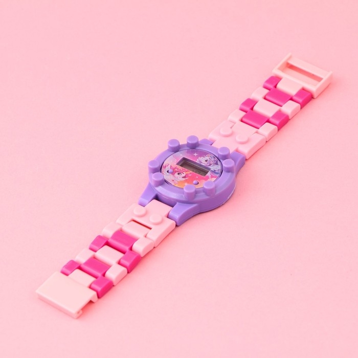 Электронные часы с ремешком-конструктором станут ярким аксессуаром вашего ребенка, съемные ремешки позволят скорретировать нужную длину (инструкция по сборке расположена на обороте упаковки). Часы показывают число, время и месяц.