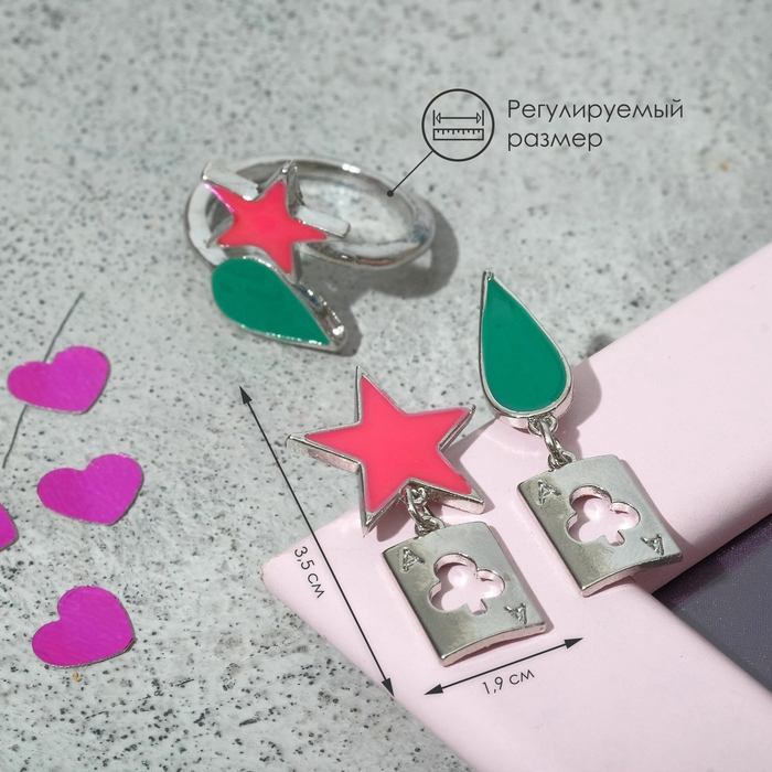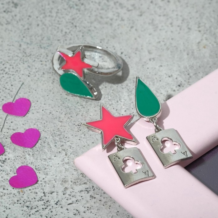 Набор: серьги, кольцо «Аниме» звезда и капля, цвет зелёно-розовый в серебре