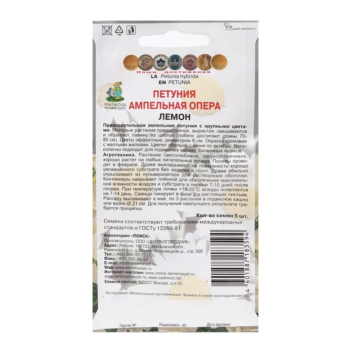 Семена цветов Поиск петуния Опера Лемон — однолетнее ампельное растение. Оно вырастает до 30 см в высоту. Окраска — лимонно-белая, от центра к волнистому краю расходятся темные прожилки. Может выращиваться в доме в балконном ящике, на клумбе в парке или на дачном участке. При составлении композиций следует размещать петунию на переднем плане, чтобы более высокие растения не загораживали ей свет.