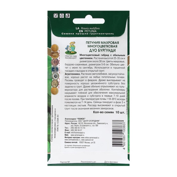 Семена Петуния махровая многоцветковая Дуо бургунди. Многочисленные махровые шарики цветов на раскидистых кустиках. Растения высотой 25-35 см и диаметром около 30 см. Цветы махровые бордово-сиреневые. Обильно цветет с июня по сентябрь. Растение светолюбивое, засухоустойчивое, хорошо растет на любых питательных почвогрунтах. Посев семян на рассаду проводят в мае - июне. Семена слегка вдавливают в почву, землей не присыпают. Посадочную емкость накрывают стеклом и ставят в освещенное место. Всходы появляются на 14-20 день. Сеянцы пикируют в фазе 2-х настоящих листьев. Рассаду высаживают в открытый грунт после окончания весенних заморозков.
