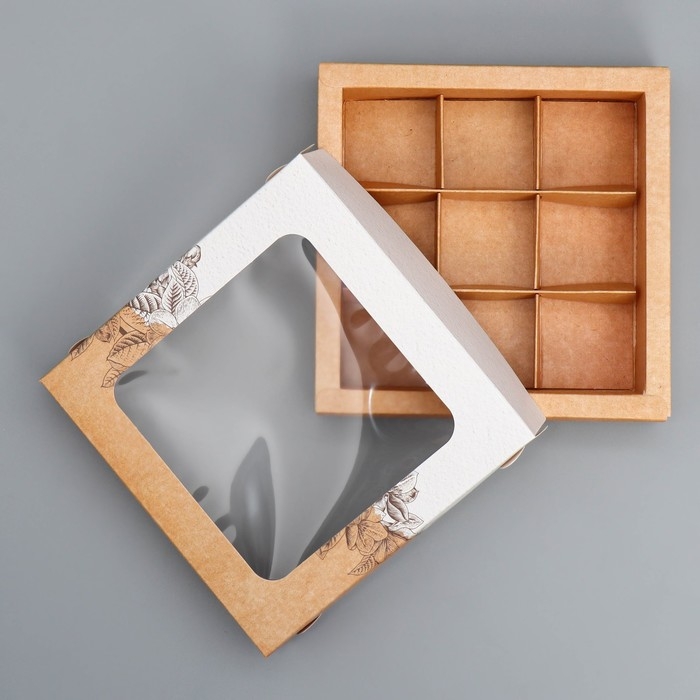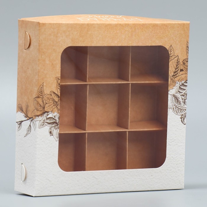 Коробка для конфет, кондитерская упаковка, 9 ячеек, «Ручная работа», 14.7 х 14.7 х 3.5 см