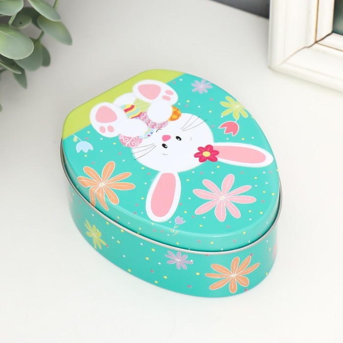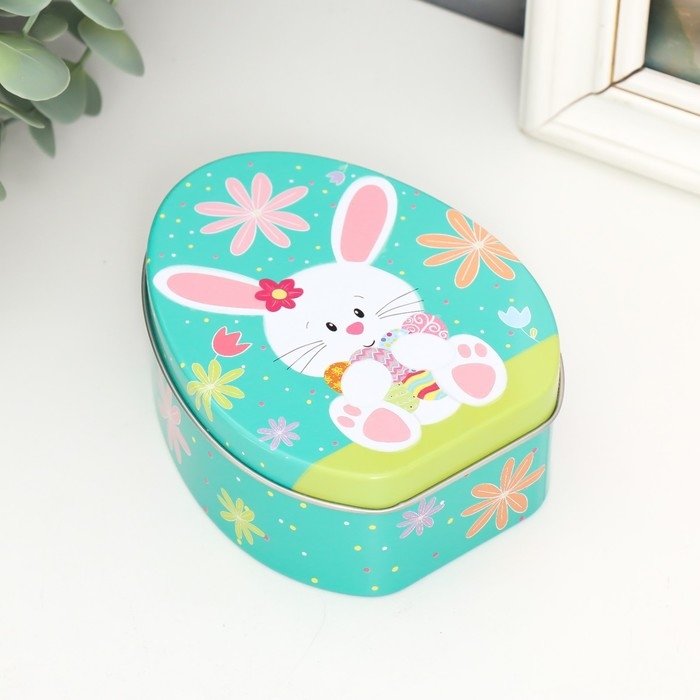 Шкатулка металл яйцо "Зайчик с охапкой раскрашенных яиц" 11,7х9,2х4,5 см
