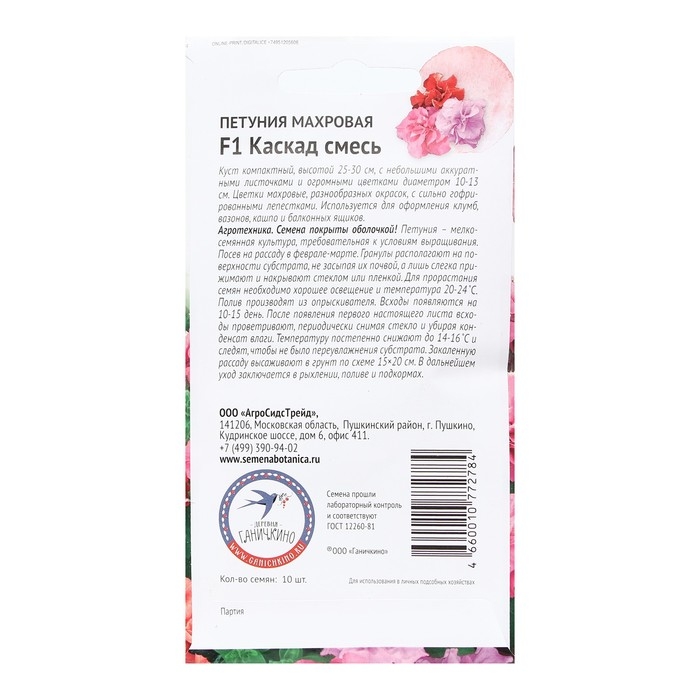 Агротехника: Семена покрыты оболочкой! Петуния – мелкосемянная культура, требовательная к условиям выращивания. Посев на рассаду в феврале-марте. Гранулы располагают на поверхности субстрата, не засыпая их почвой, а лишь слегка прижимают и накрывают стеклом или пленкой. Для прорастания семян необходимо хорошее освещение и температура 20-24С. Полив производят из опрыскивателя. Всходы появляются на 10-15 день. После появления первого настоящего листа всходы проветривают, периодически снимая стекло и убирая конденсат влаги. Температуру постепенно снижают до 14-16С и следят, чтобы не было переувлажнения субстрата. Закаленную рассаду высаживают в грунт по схеме 15 на 20 см. В дальнейшем уход заключается в рыхлении, поливе и подкормах.