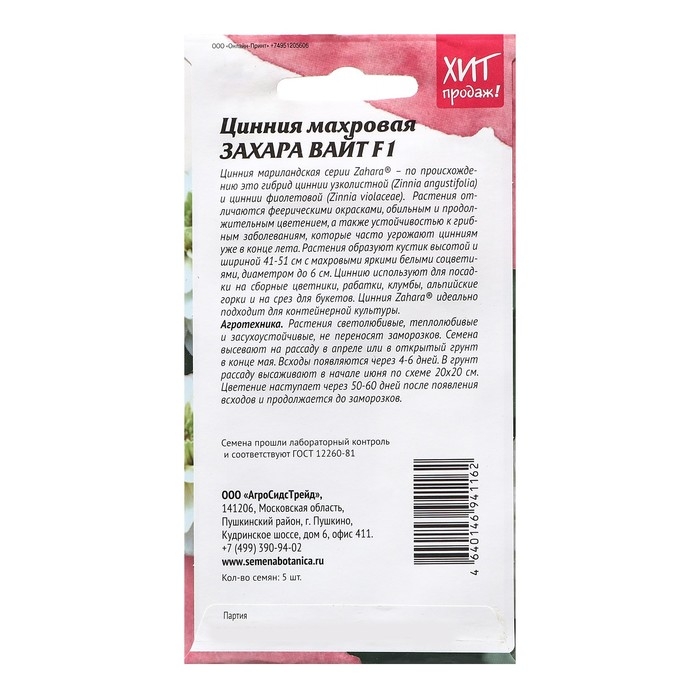 Семена Цветов Цинния "Захара Вайт", 5 шт