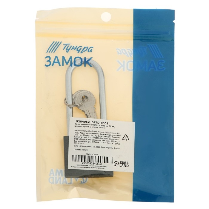 Замок навесной ТУНДРА, основание 37 мм, длинная дужка, 3 ключа, подвес
