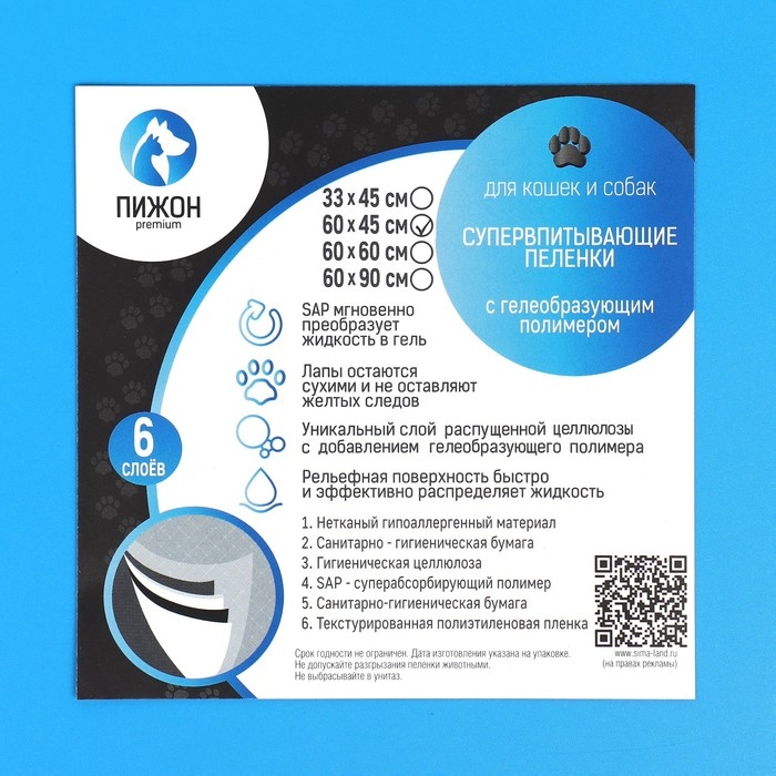 Пеленки впитывающие "ПИЖОН" для животных гелевые, 60 х 60 см, (в наборе 5 шт)