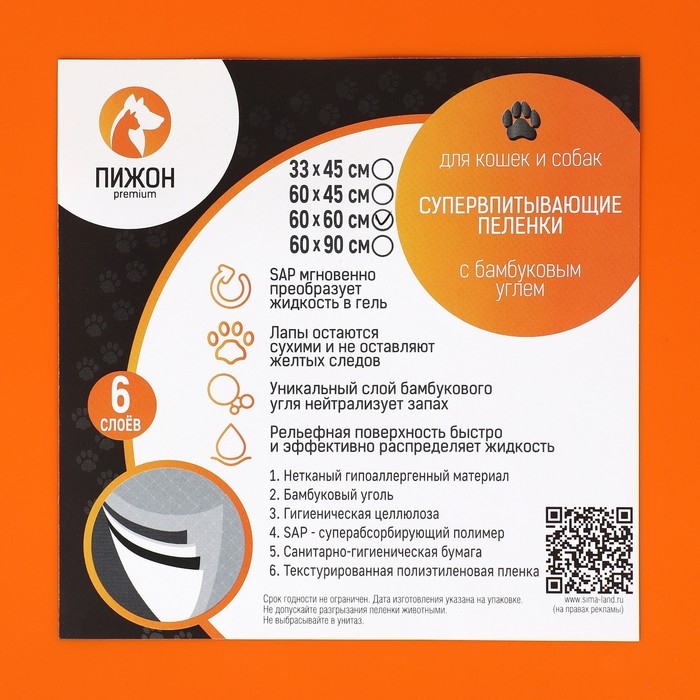 Пеленки угольные для животных шестислойные гелевые, 60 х 60 см, (в наборе 5 шт)