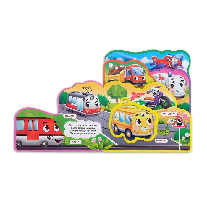 Мягкая книга сделана из приятного на ощупь пористого материала EVA. На каждой странице приклеены яркие иллюстрации с разным транспортом, которые понравятся малышу.