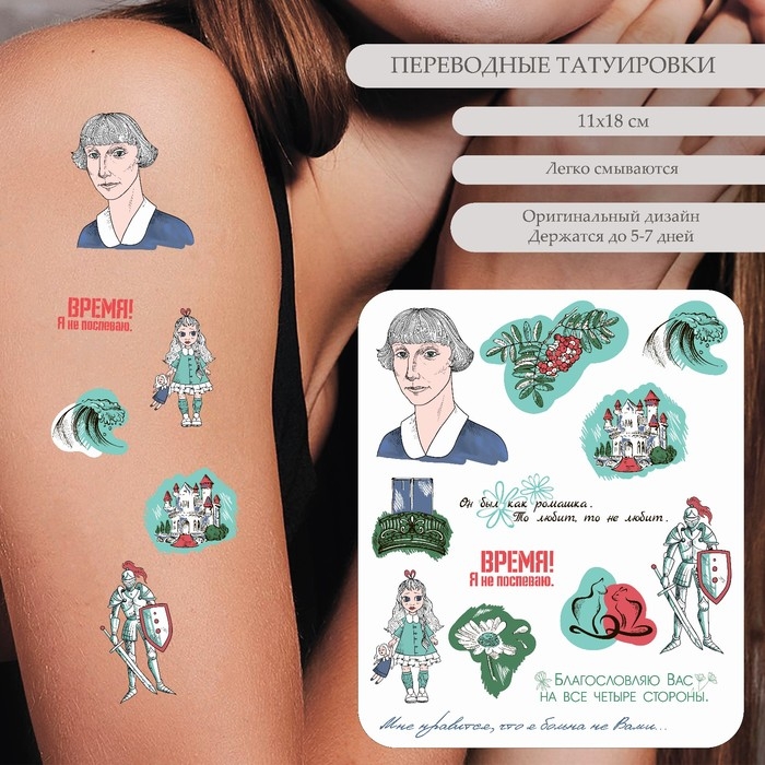 Татуировка на тело цветная "М.И. Цветаева - Время! Я не поспеваю." 18х11 см