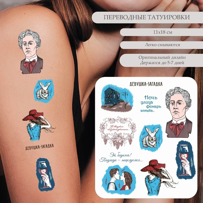 Татуировка на тело цветная "А.А. Блок - Ночь, улица, фонарь, аптека" 18х11 см