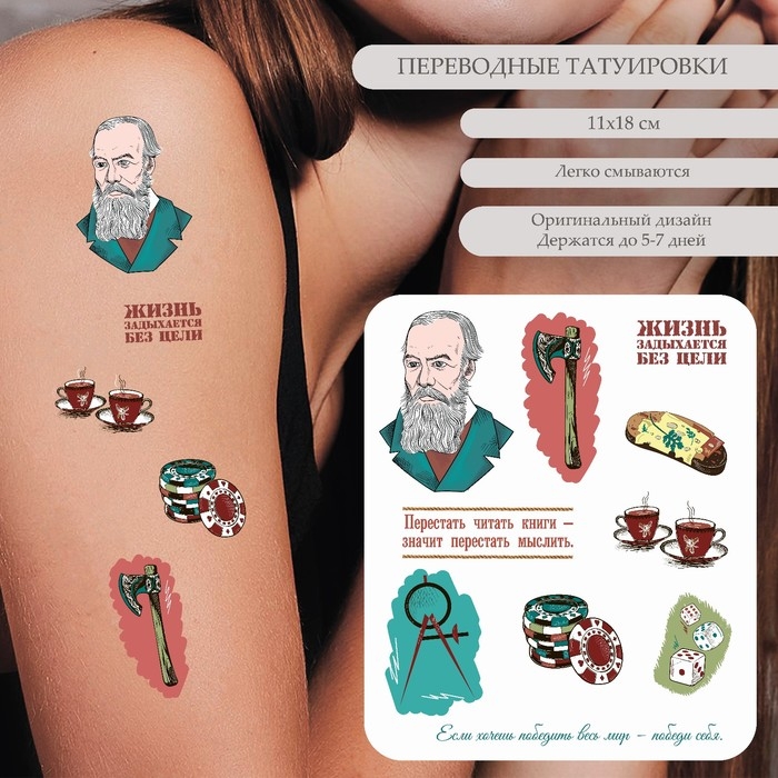 Татуировка на тело цветная "Ф.М. Достоевский - Жизнь задыхается без цели" 18х11 см