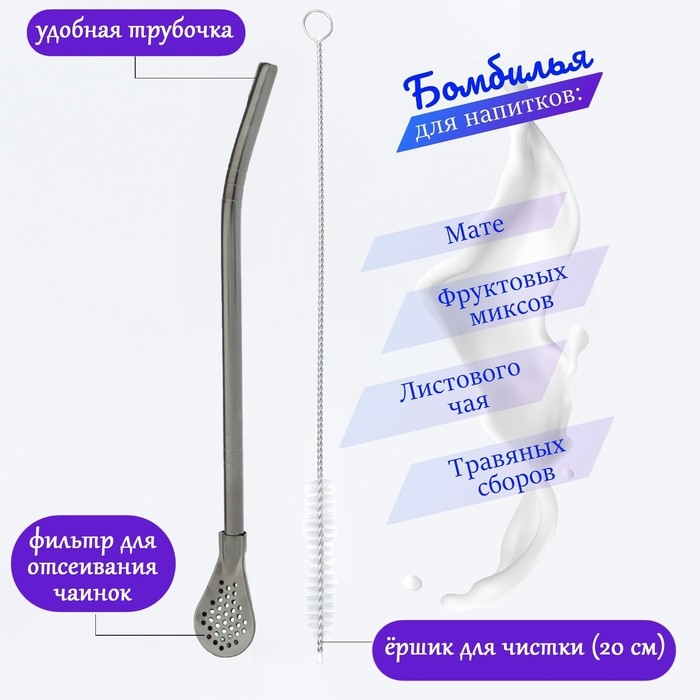 По традиции, аргентинский чай Йерба Мате пьют из специальных сосудов (калабаса) через трубочку с отверстиями для фильтрации мелкой фракции листа (бомбилья). Но в наши дни эта конструкция стала популярна так же для самых разных напитков: фитосборов, фруктовых и ягодных миксов, цветочного чая, каркаде, привычного листового чая и т.д. Бомбилья - отличная замена пластиковым трубочкам для любых коктейлей тем, кто заботится об окружающей среде.